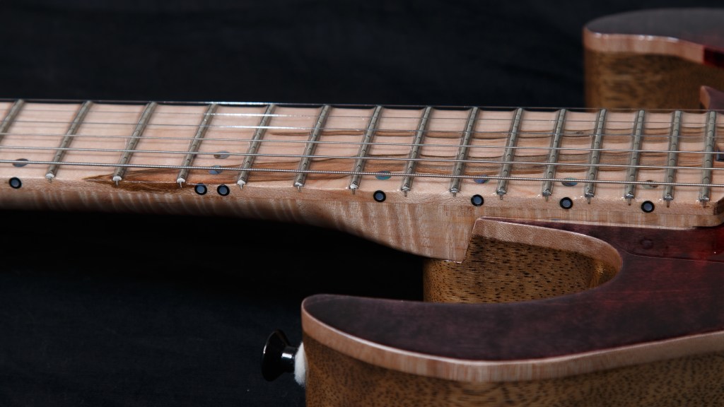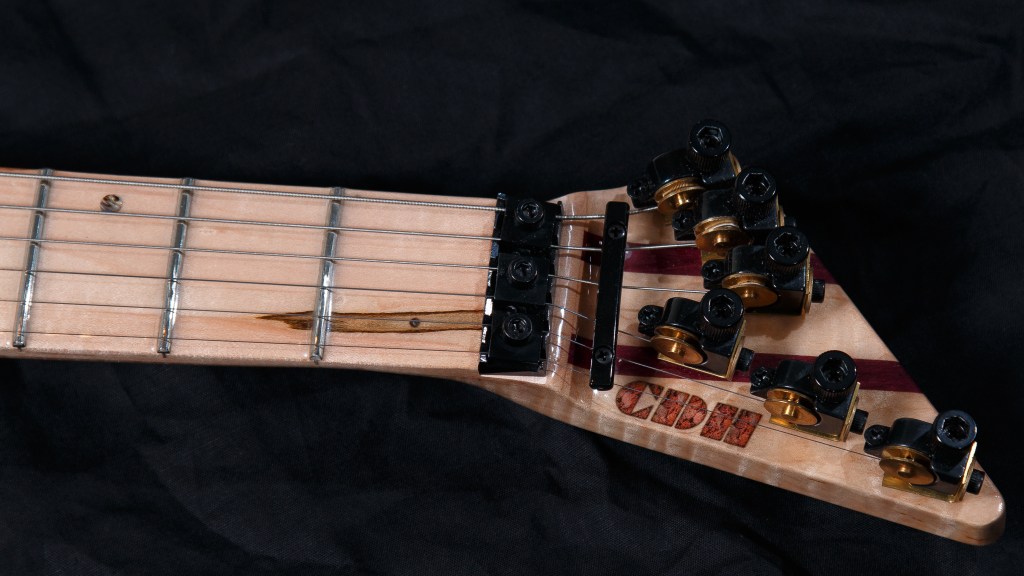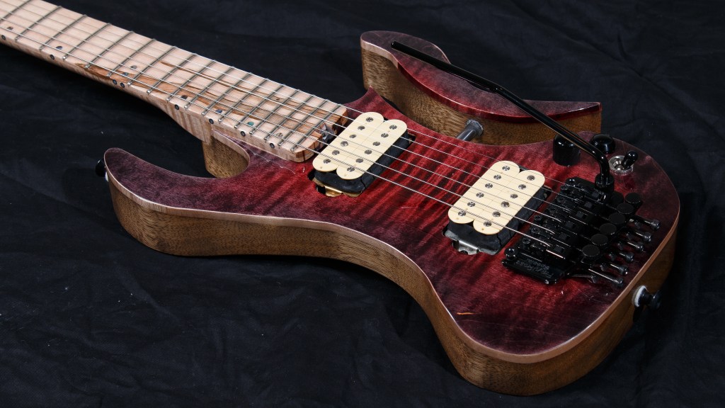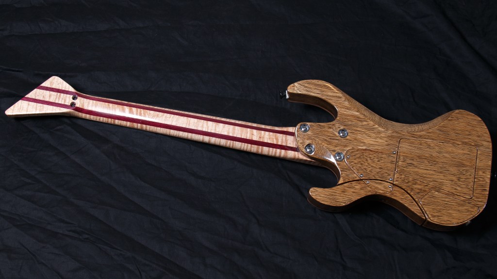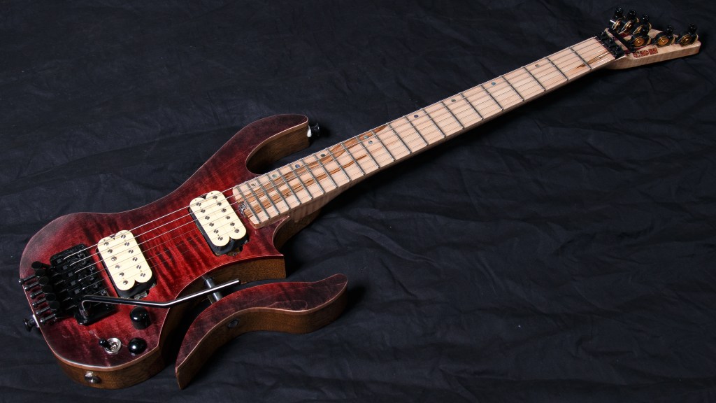 Custom handmade full scale travel guitar, with a compound radius fingerboard, a Floyd Rose Tremolo and a unique slide-out waist bout, giving it the playability and comfort of a full sized custom guitar as well as compact storage and portability.